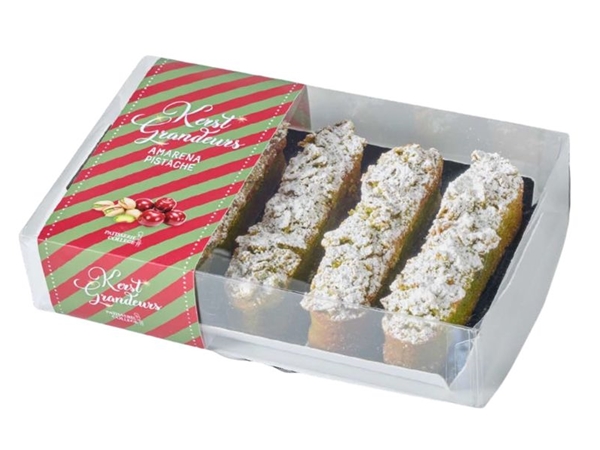 5 Cakejes met een zachte pistachelvulling met een kern van italiaanse Amarena kersen op een bodem van boterdeeg en krokante amandelen.
