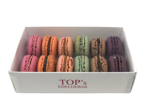 Per 12 stuks Luchtig amandel schuim koekje gevuld met een canache van diverse smaken.