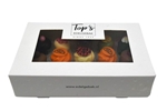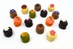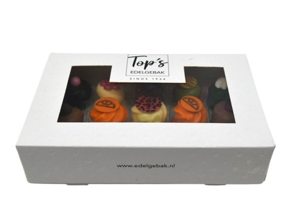 15 Kleine thee gebakjes in allerlei romige smaken op een koekje van amandelspijs overgoten met chocolade.