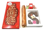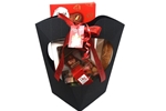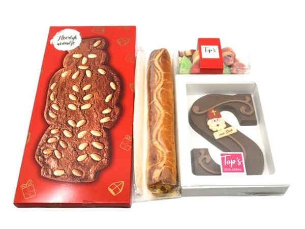 Pakket wordt verpakt in een zwarte leuke open doos gevuld met een staaf, speculaaspop, chocolade letter S en een boxje winterkost.