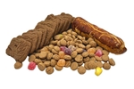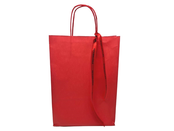 Pakket wordt verpakt in een rood cadeautasje gevuld met een pakketstaaf, pakje speculaas zonder amandelen en een zakje strooigoed.