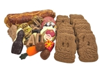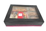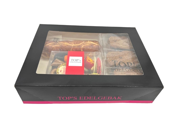 Pakket wordt verpakt in een doos met doorkijkvenster en gevuld met een pakketstaaf, box sint chocolade en een pakje speculaas zonder amandelen.