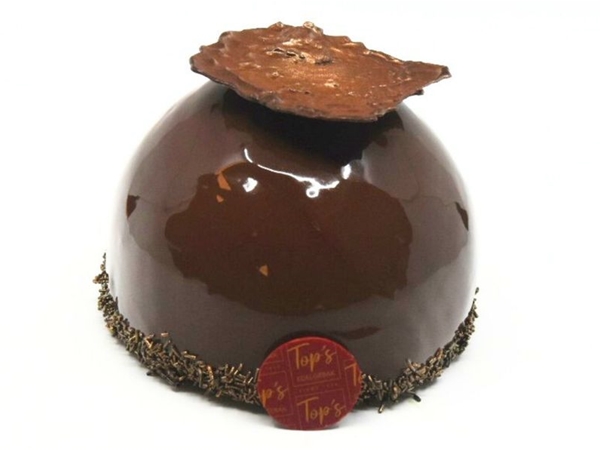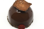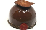 Taart met een krokante bodem en gevuld met chocolade mousse,chocolade cake overgoten met een rode glacage en afgewerkt als een kerstbal met chocolade bovenop.