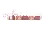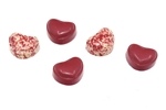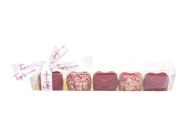 Rood met wit hartje is gevuld met passie caramel en lichte koffie ganache. Rood hartje is gevuld met hazelnoot ganache